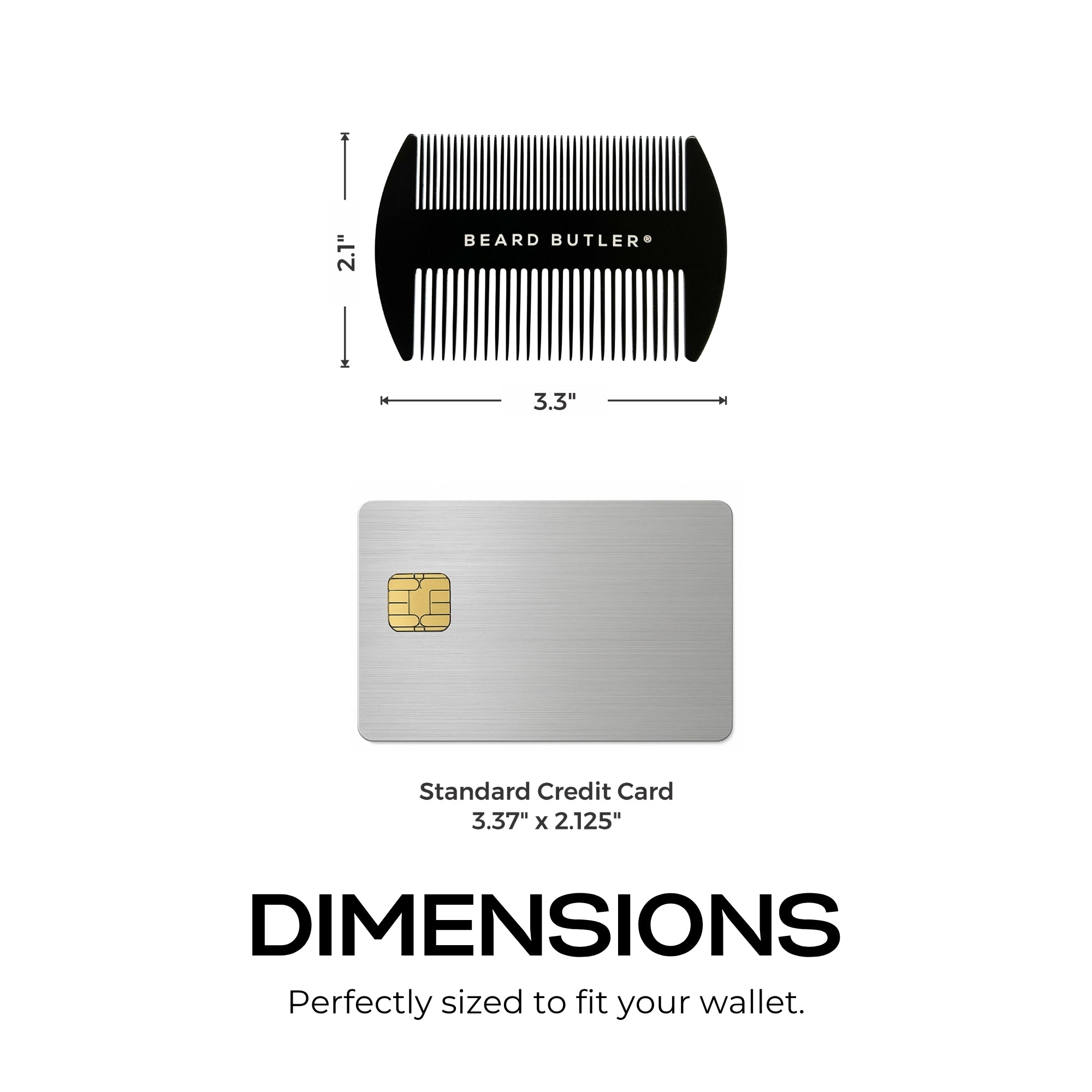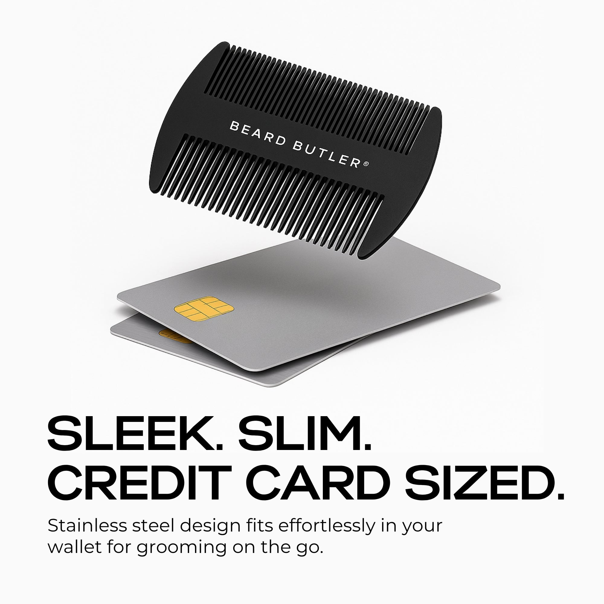 Slim, ultra-light, and the size of a credit card, this comb slips effortless into your wallet so it's always at hand wherever the day takes you. Built from black stainless steel, it delivers class and durability with smooth, anti-static performance to keep your beard sharp and refined--anytime, anywhere.